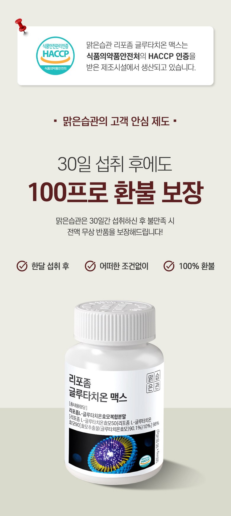 | 제품명 | 맑은습관 리포좀 글루타치온 맥스 | 제조업소의 명칭과 소재지 | 맑은습관 협력사 |