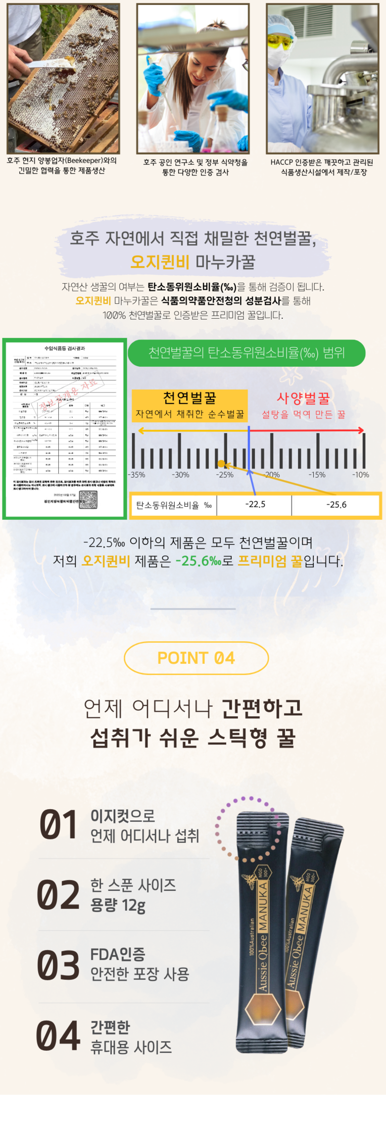 | 포장단위별 내용물의 용량(중량), 수량 | 12g, 60개입, 720g | 원재료명 및 함량 | 마누카꿀 100% |