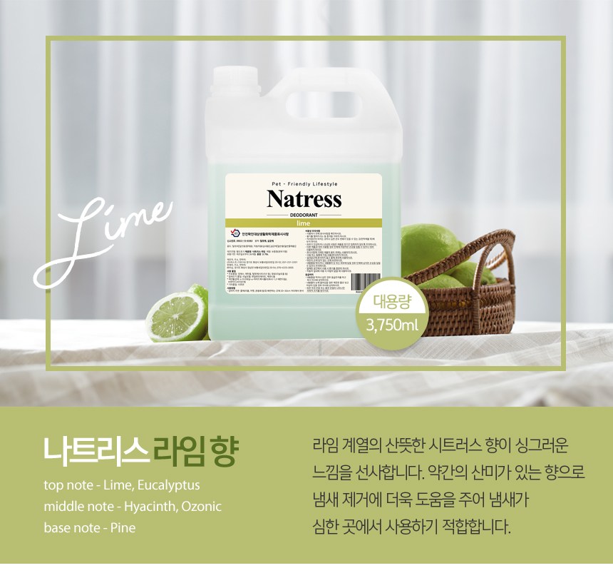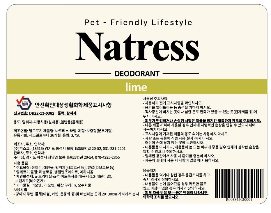 | 품목 및 제품명 | 탈취제,살균제/나트리스 라임 | 용도(표백제의 경우 계열을 함께표시) 및 제형 | 자동차용-실내용,일반용-물체용,일반용-일반물체용/분사형-분무기형,분사형-보충형(분무기형) |