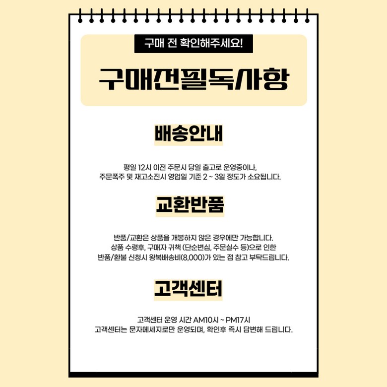 - ㆍ모니터 해상도의 차이로 인해 색상이나 이미지가 실제와 달라, 고객이 단순 변심으로 교환/반품을 무료로 요청하는 경우