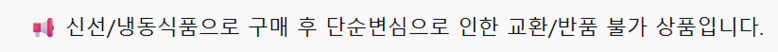 | 계절상품/식품/화장품 | ㆍ신선/냉장/냉동 상품의 단순변심의 경우 ㆍ뷰티 상품 이용 시 트러블(알러지, 붉은 반점, 가려움, 따가움)이 발생하는 경우, |