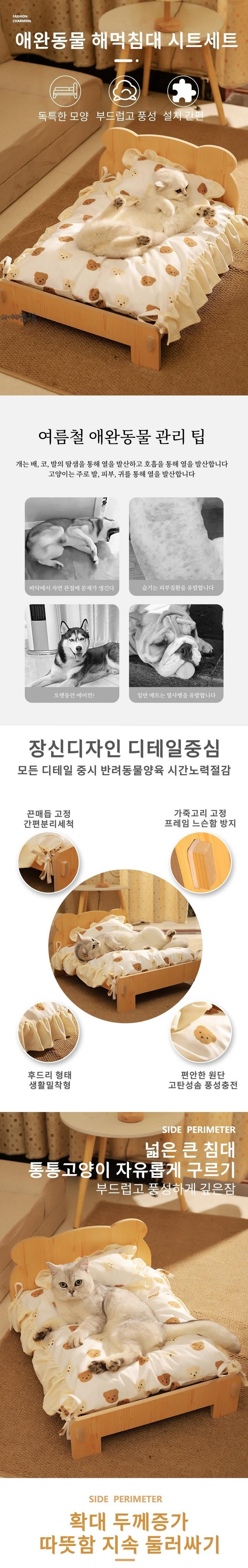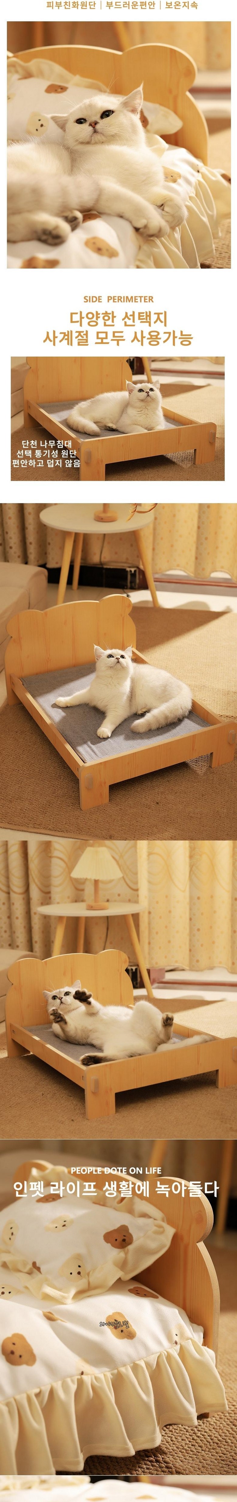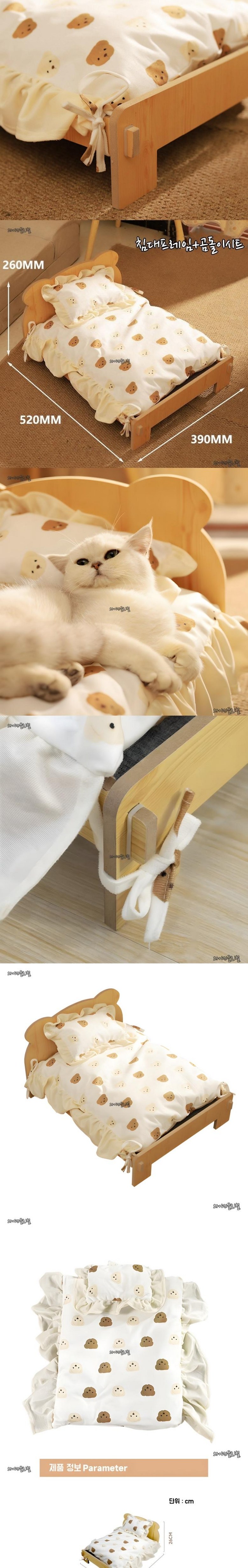 반려동물을 위한 친환경 원목 침대 + 곰돌이 시트 & 배개 세트