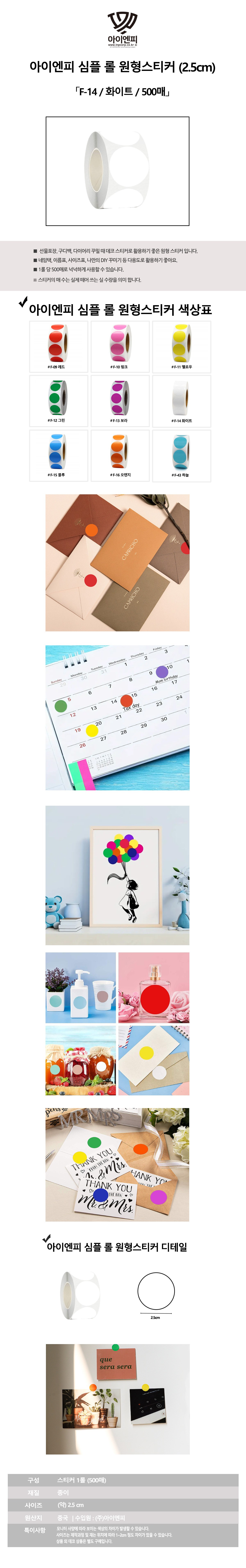 | 품명 및 모델명 | 아이엔피 심플 롤 원형스티커(2.5cm)[F-14/화이트] | 인증/허가 사항 | 해당없음 |