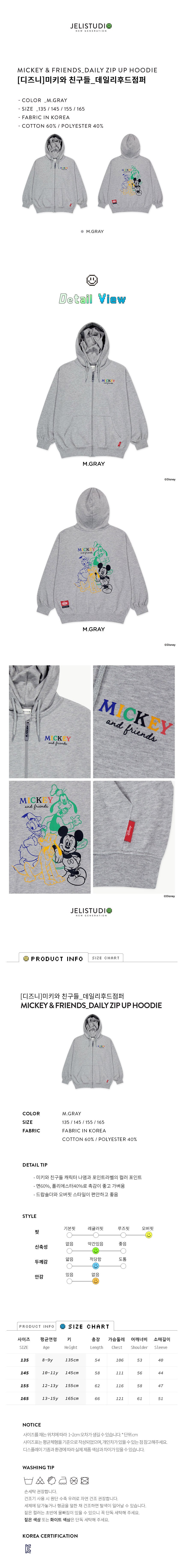 | 품명 및 모델명 | 젤리스튜디오 [디즈니]미키와 친구들 데일리후드점퍼 M그레이 155 | KC 인증정보 | 유/KC마크 |