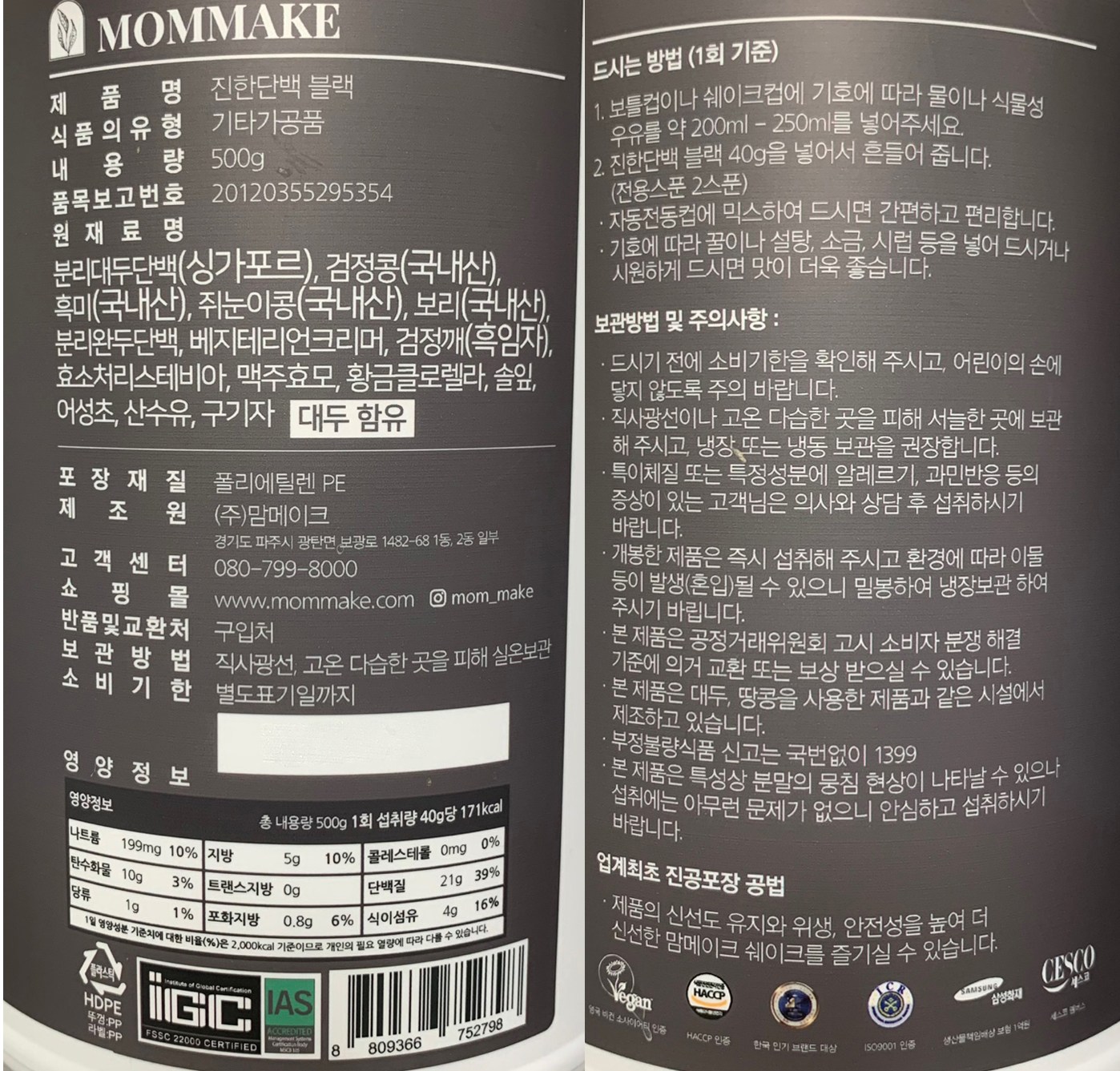 | 포장단위별 내용물의 용량(중량), 수량 | 500g x 2개 | 원재료명 및 함량 | 컨텐츠 참조 |