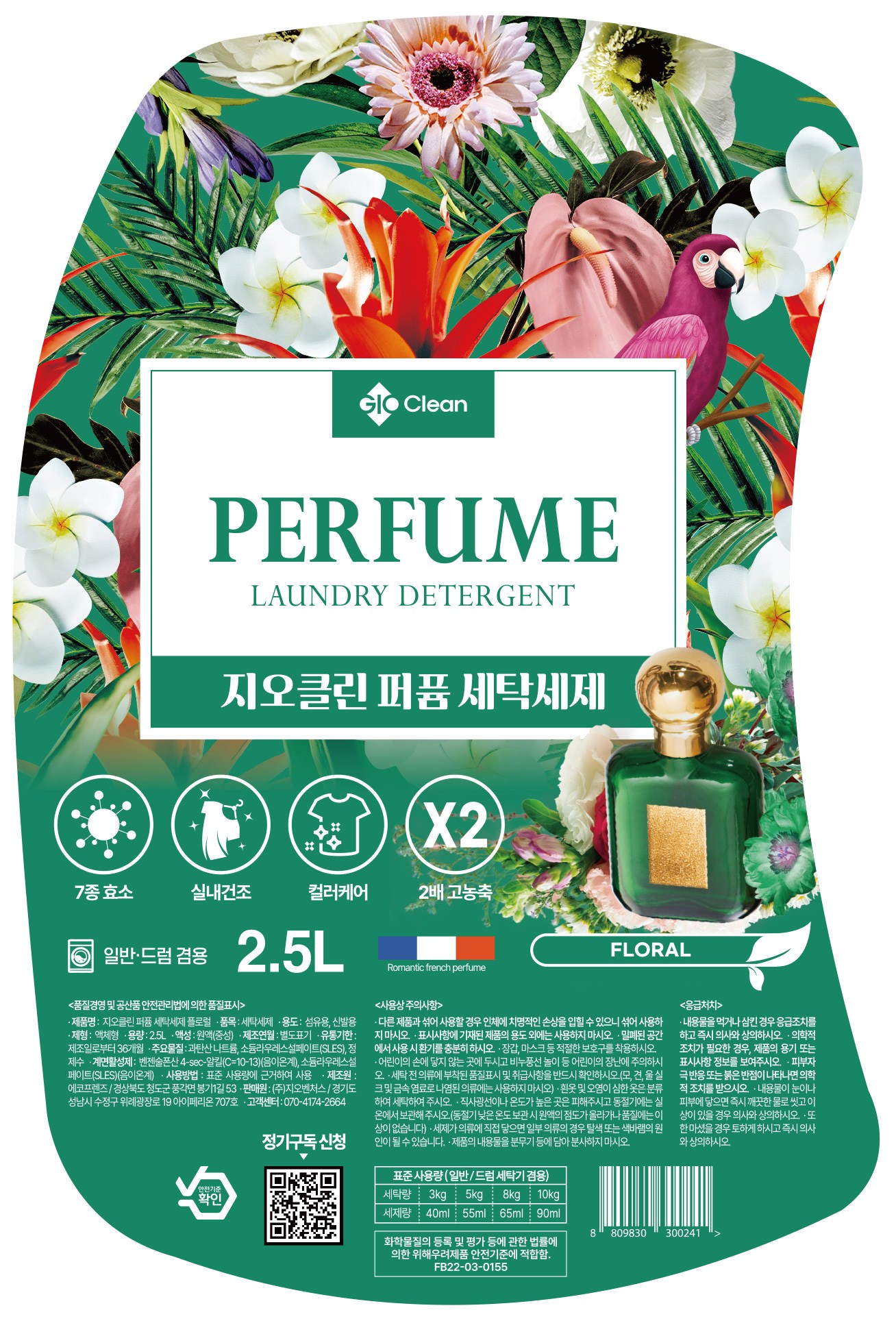 | 품목 및 제품명 | 세탁세제 / 지오클린 퍼퓸 세탁세제 플로럴 | 용도(표백제의 경우 계열을 함께표시) 및 제형 | 섬유용, 신발용 / 액체형 |