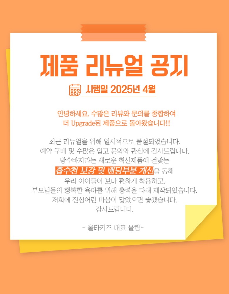| 품명 및 모델명 | 올타키즈 입는 아기 방수패드 유아 방수매트 방수요 | 인증/허가 사항 | KC인증 어린이제품 공급자적합성확인 SR0B24-00003875 |