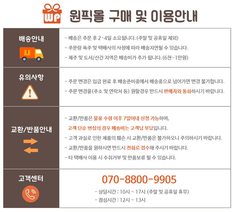 - ㆍ모니터 해상도의 차이로 인해 색상이나 이미지가 실제와 달라, 고객이 단순 변심으로 교환/반품을 무료로 요청하는 경우