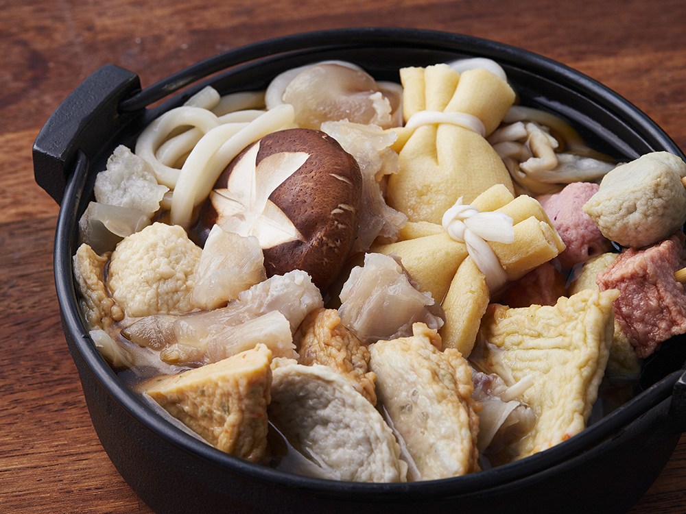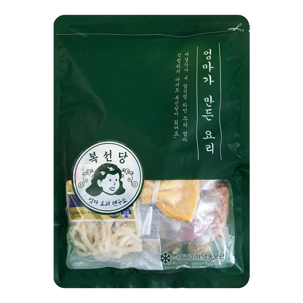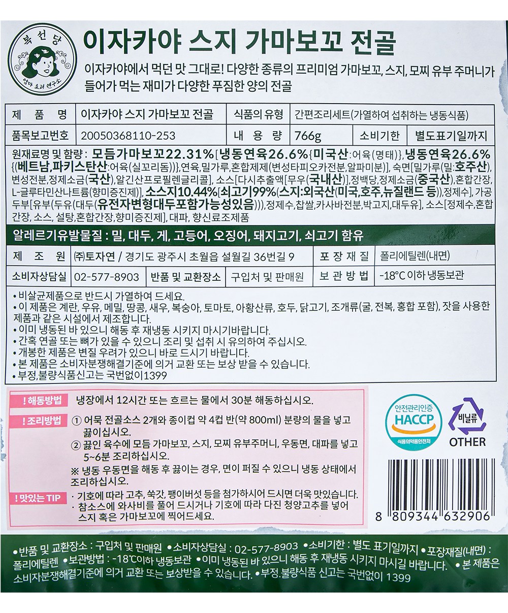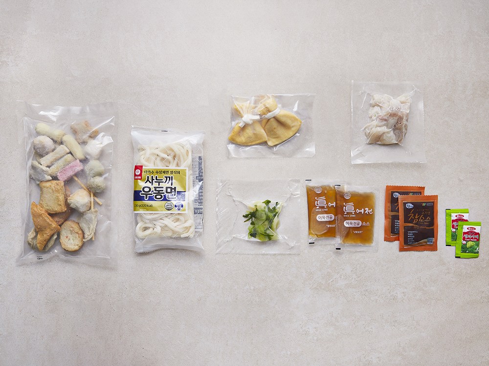 모듬 가마보꼬, 사누끼 우동면, 모찌 유부주머니, 대파, 어묵 전골소스, 소 스지, 참소스, 와사비로 구성되어 있습니다.