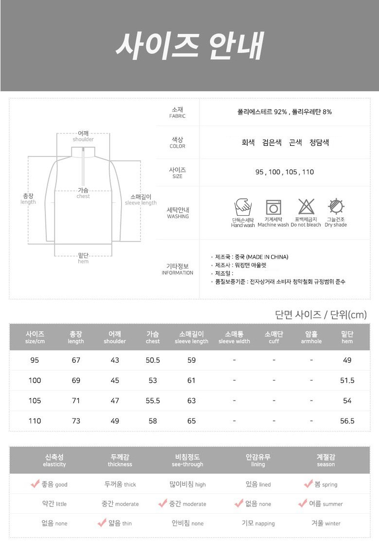 | 제조국 | 상품 상세페이지 참조 | 세탁방법 및 취급시 주의사항 | 상품 상세페이지 참조 |