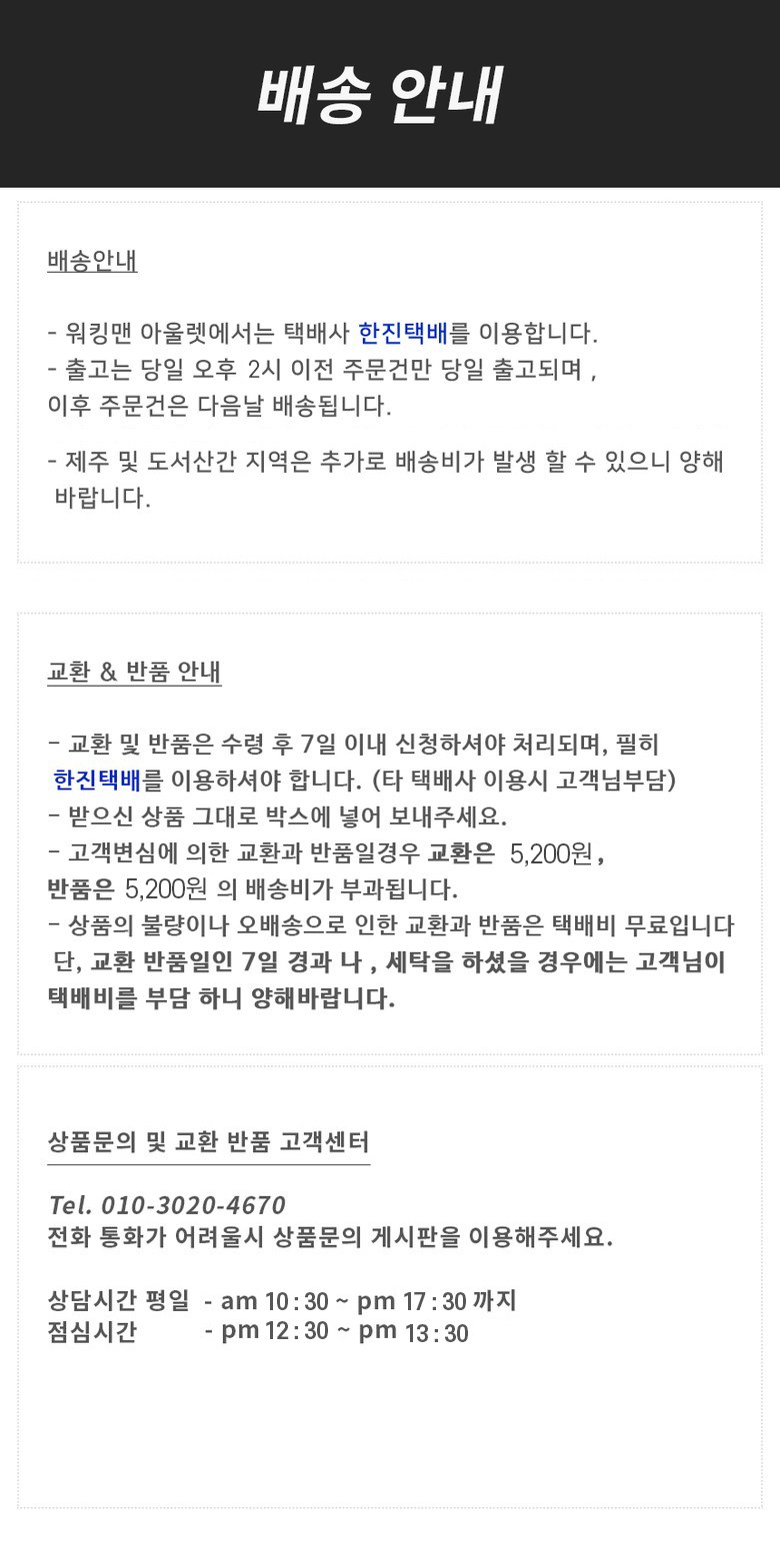 | 교환/반품 비용 (왕복비용) | 5,200원 - 단, 고객 변심의 경우에만 발생 - 도서산간 및 일부 지역 추가비용 발생 |