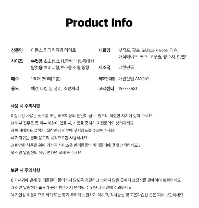 | 품명 및 모델명 | 아몬스 입다 절약형 기저귀 | 인증/허가 사항 | 상품 상세페이지 참조 |