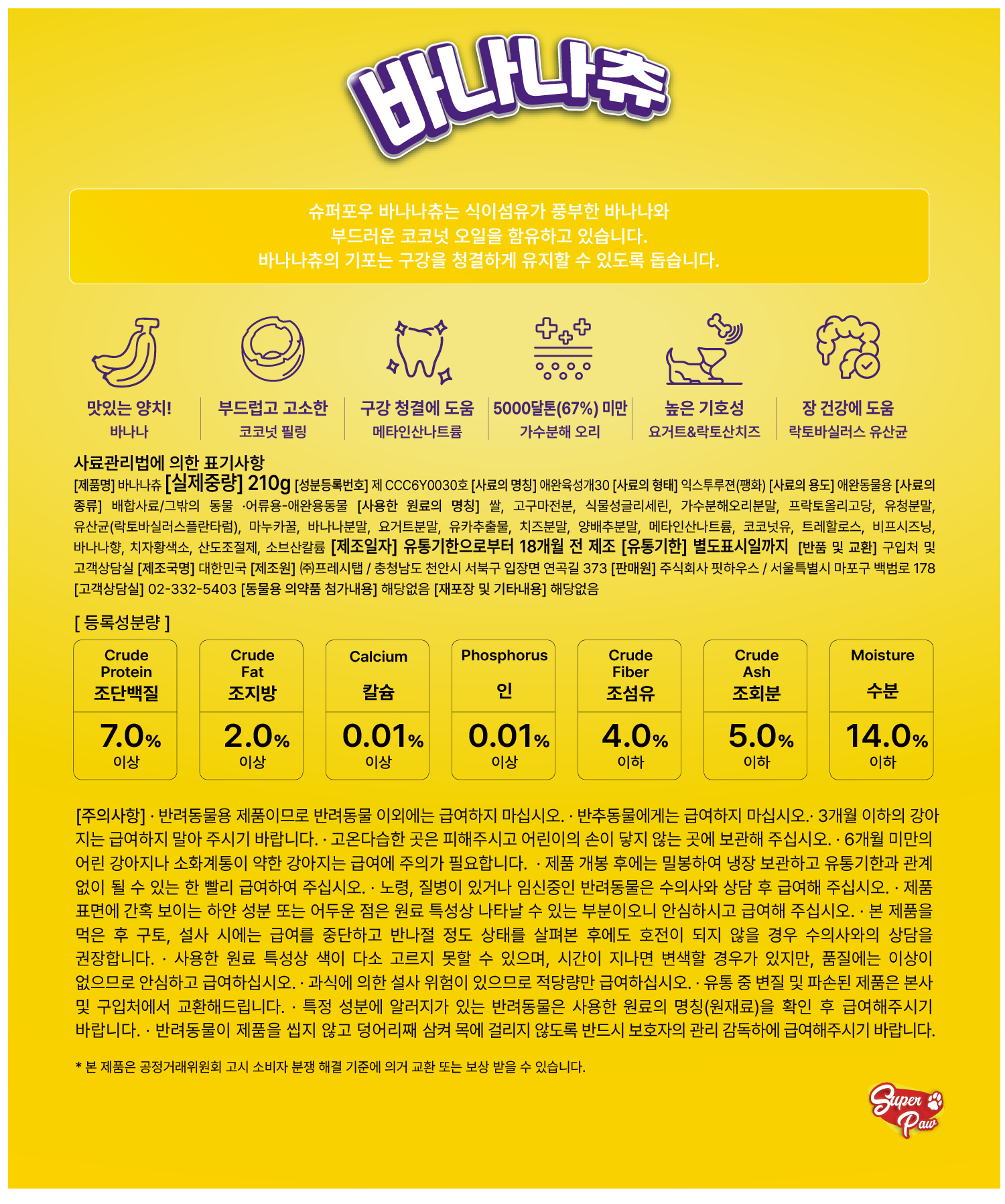 | 품명 및 모델명 | 바나나츄 | 인증/허가 사항 | 사료관리법에 따른 성분등록번호 : 컨텐츠 참조 |