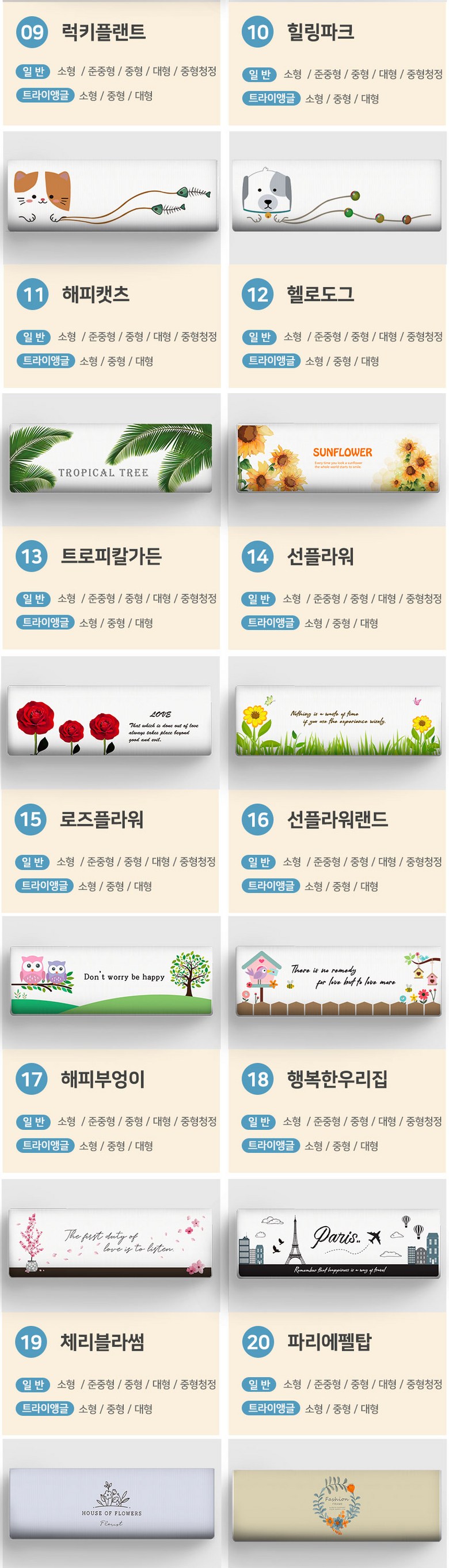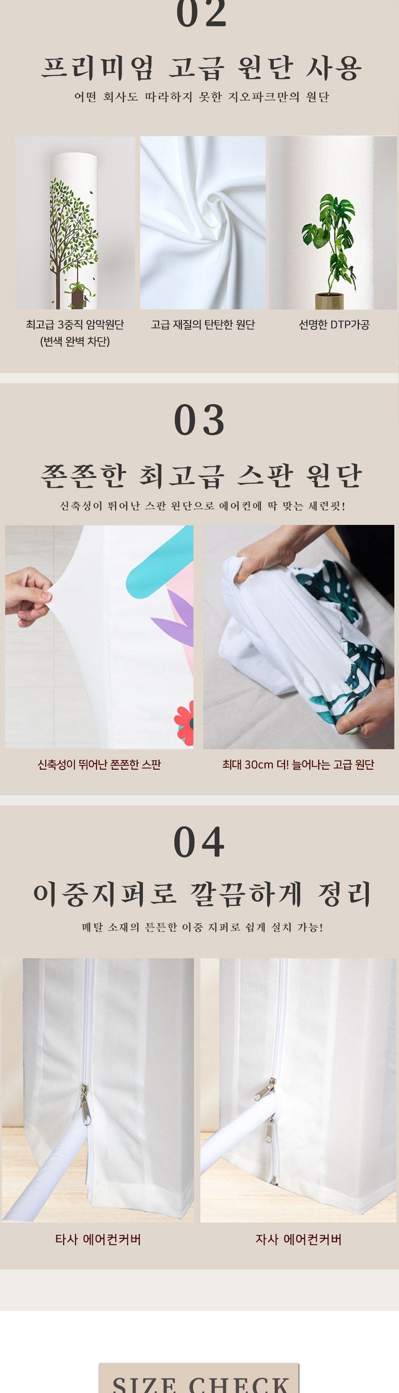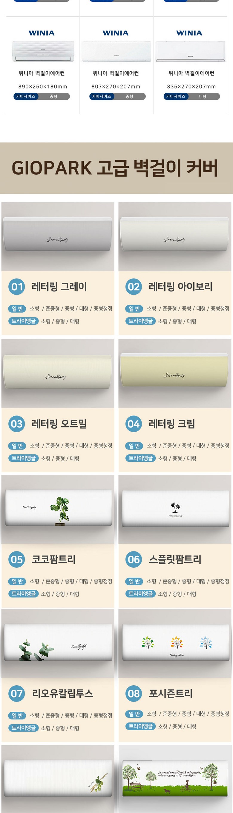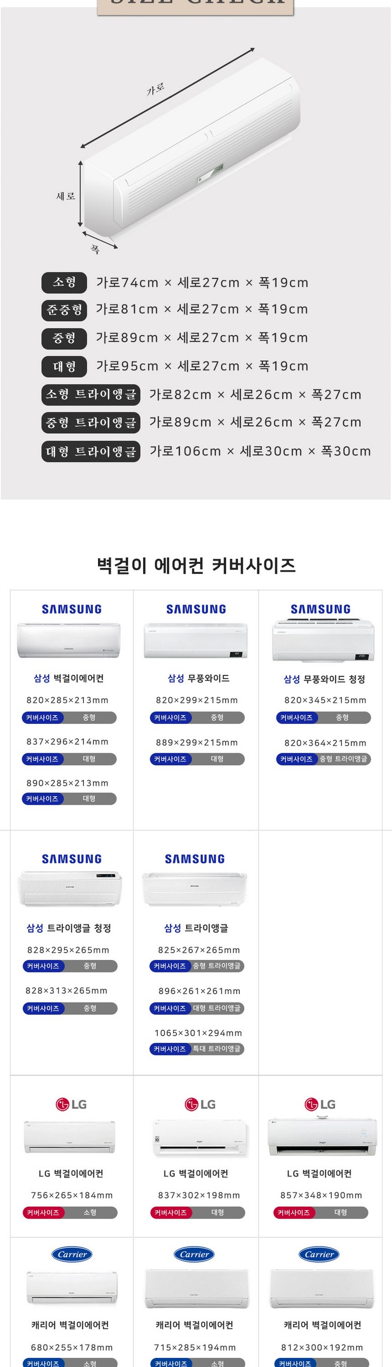 | 치수 | 01.소형(74x27x19cm),02.준중형(81x27x19cm),03.중형(89x27x19cm),04.대형(95x27x19cm),05.소형 트라이(82x26x27cm),06.중형 트라이(89x26x27cm),07.대형 트라이(106x30x30cm) | 제품구성 | 에어컨커버 1 EA |