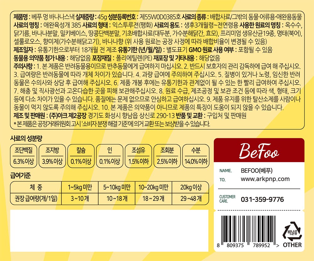 | 품명 및 모델명 | 베푸 멍 바나나스낵 | 인증/허가 사항 | 사료관리법에 따른 성분등록번호 : 컨텐츠 참조 |
