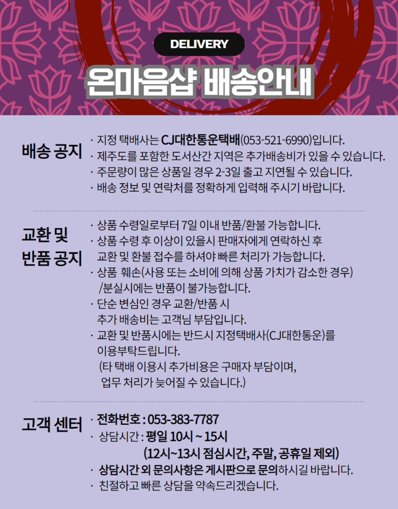 - 상품문의 및 후기게시판을 통해 취소나 환불, 반품 등은 처리되지 않습니다.