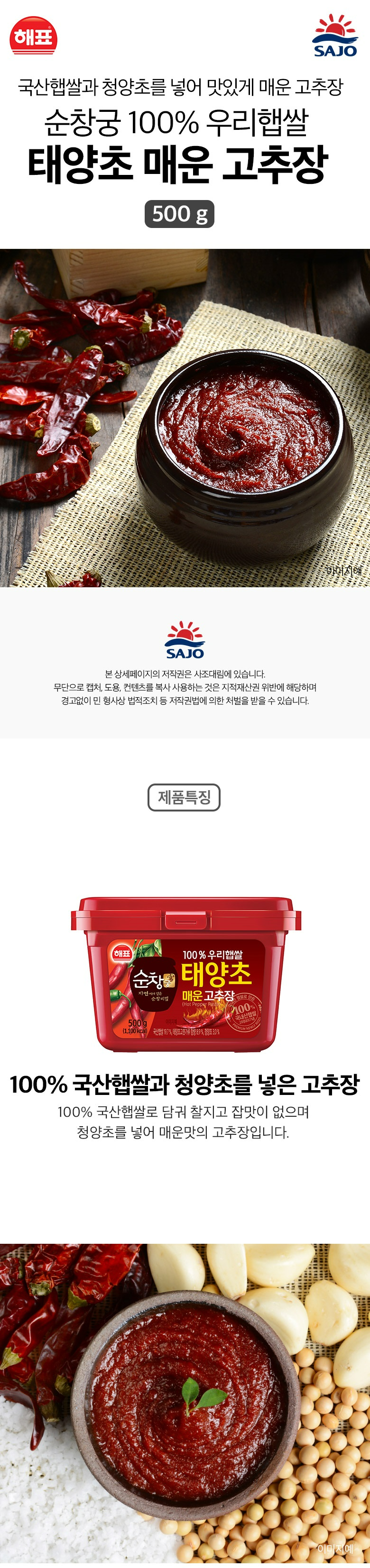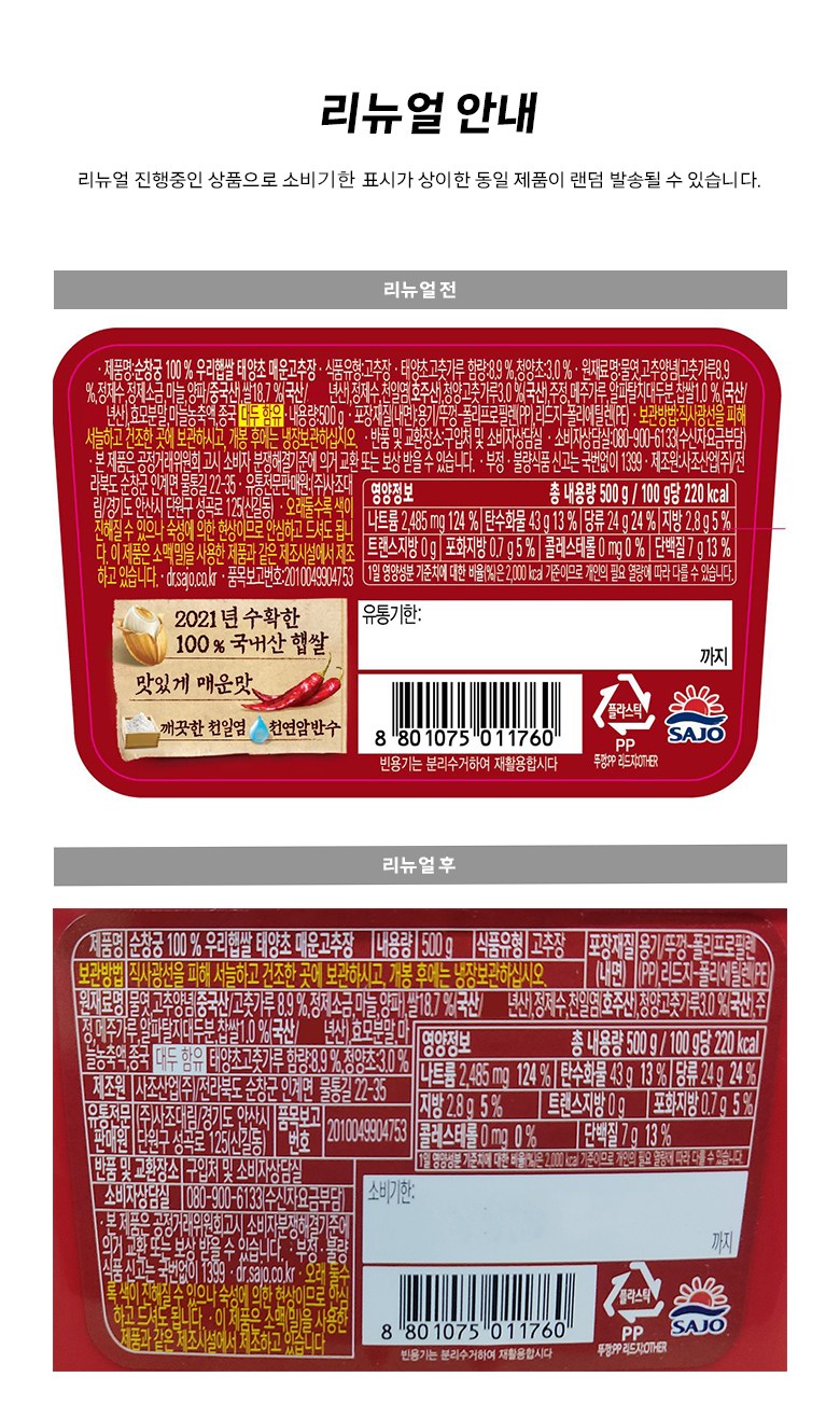 | 제품명 | 순창궁 100%우리햅쌀 태양초 매운고추장 | 식품의 유형 | 컨텐츠 참조 |