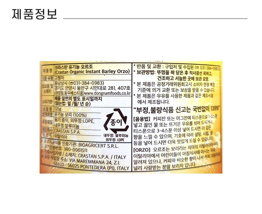 | 제품명 | 크라스탄 유기농 오르조 | 식품의 유형 | 고형차 |