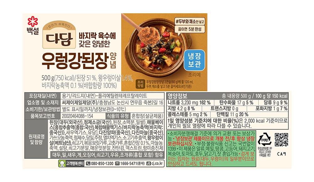 | 제품명 | 다담 우렁 강된장양념 | 식품의 유형 | 컨텐츠 참조 |