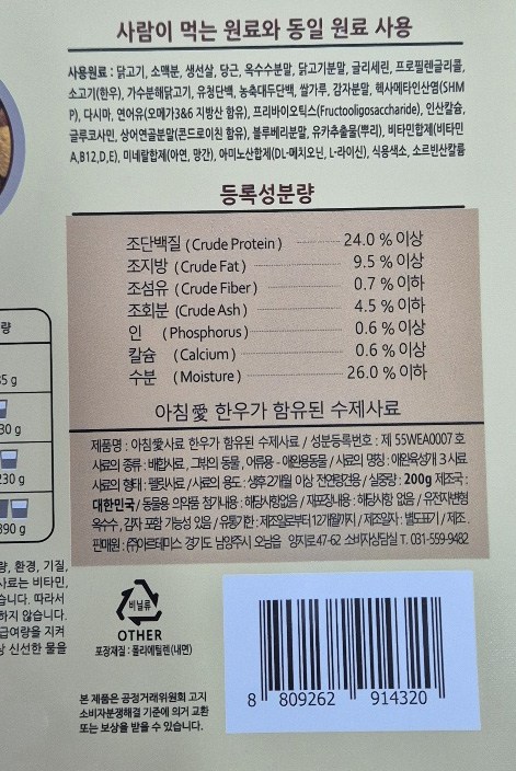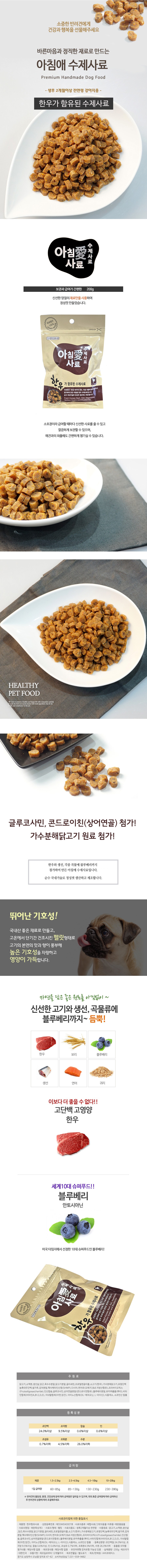 | 품명 및 모델명 | 아침愛사료 한우가 함유된 수제사료 | 인증/허가 사항 | 사료관리법에 따른 성분등록번호 : 컨텐츠 참조 |