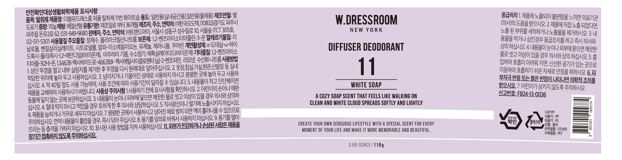 | 품목 및 제품명 | 탈취제 / 더블유드레스룸 퍼퓸 탈취제 11번 화이트솝 | 용도(표백제의 경우 계열을 함께표시) 및 제형 | 일반용-실내공간용,일반용-물체용 / 비분사형-에멀션형 |