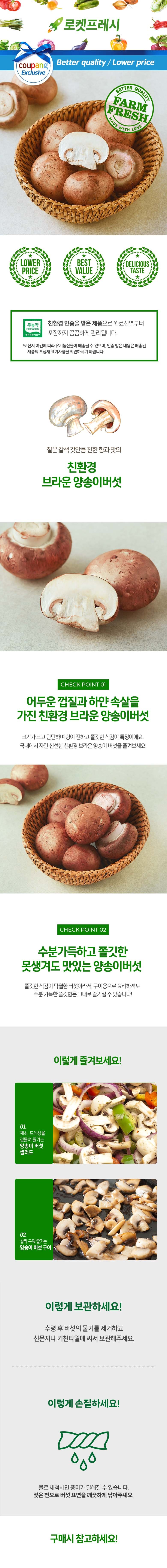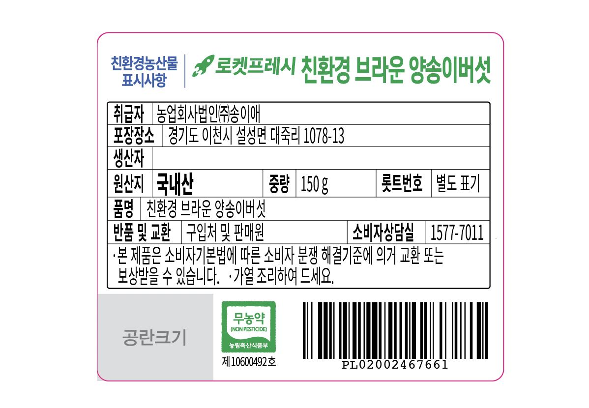 | 품목 또는 명칭 | 친환경 브라운 양송이버섯 150g_PL_vege | 포장단위별 내용물의 용량(중량),수량,크기 | 150g x 1개입 x 3개 |