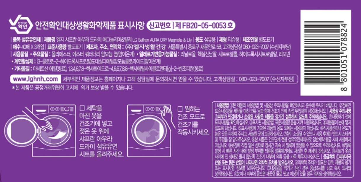 | 품목 및 제품명 | 섬유유연제 / 엘지 샤프란 아우라 드라이 매그놀리아&릴리 | 용도(표백제의 경우 계열을 함께표시) 및 제형 | 섬유용 / 비분사형-티슈형 |