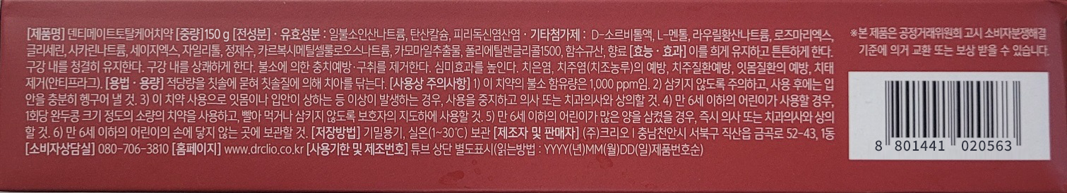 | 품명 및 모델명 | 덴티메이트토탈케어치약 | 인증/허가 사항 | 의약외품 |