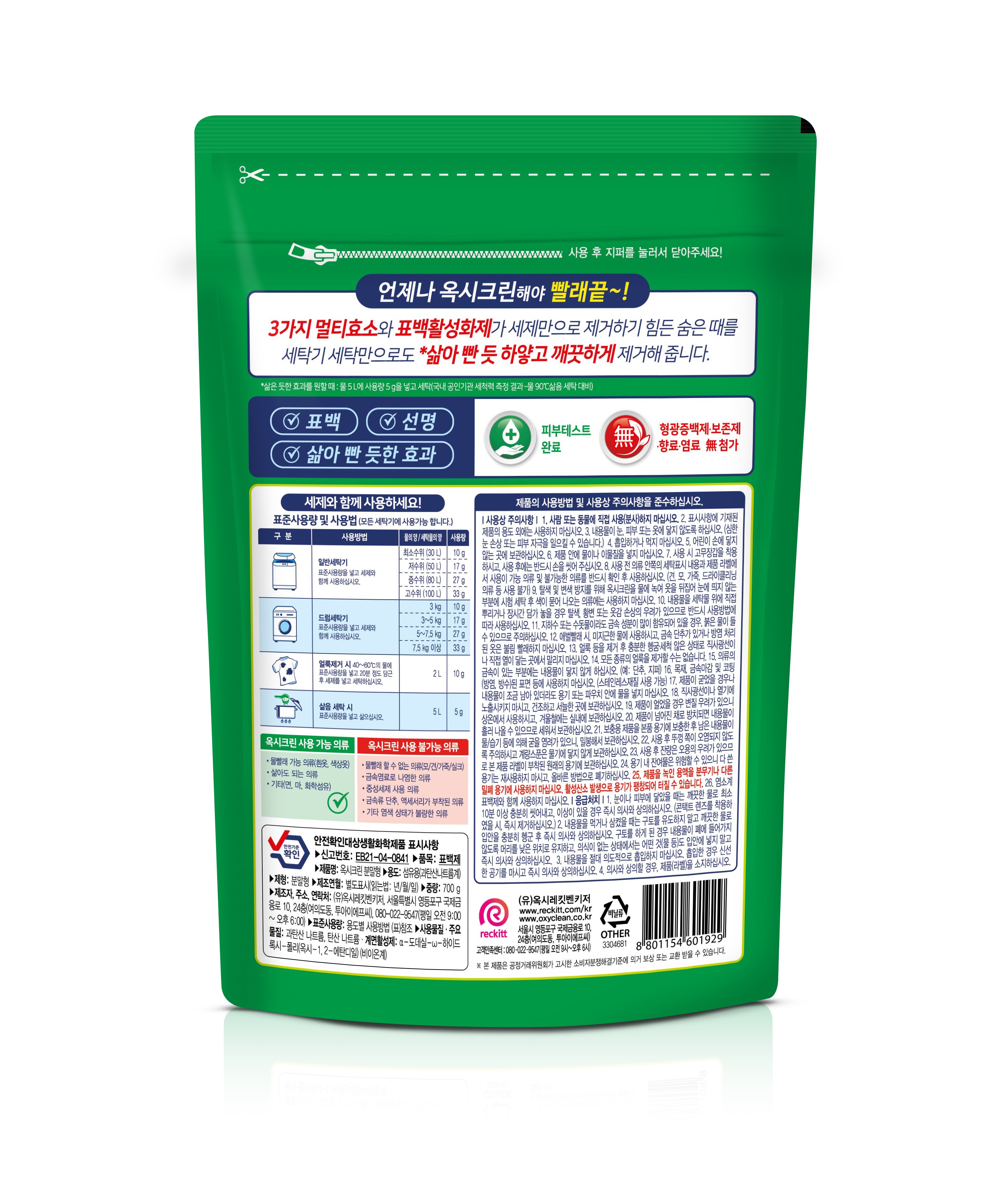 | 품목 및 제품명 | 표백제 / 옥시크린 분말형 | 용도(표백제의 경우 계열을 함께표시) 및 제형 | 섬유용(과탄산나트륨계) / 분말형 |