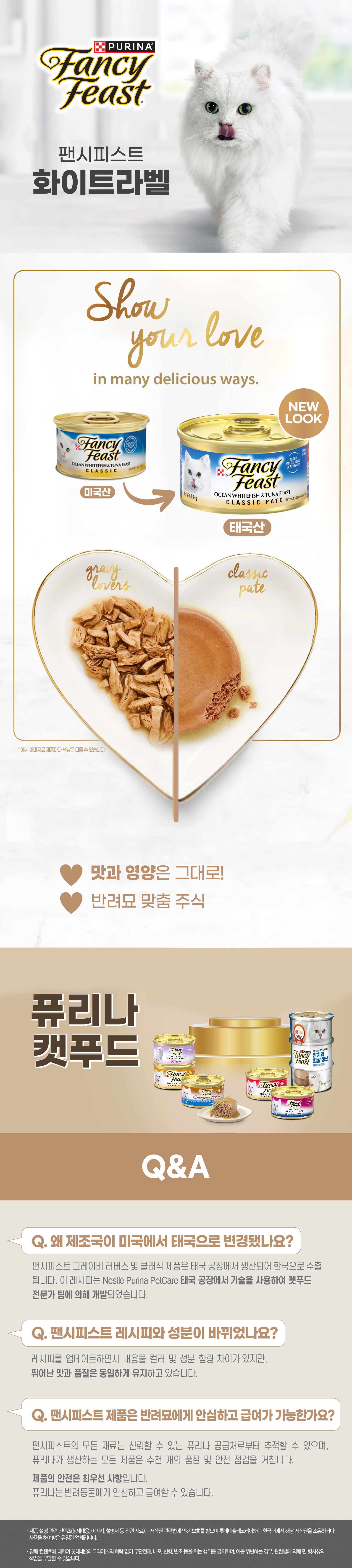 | 품명 및 모델명 | 팬시피스트 화이트피쉬&튜나 | 인증/허가 사항 | 사료관리법에 따른 성분등록번호 : 컨텐츠 참조 |