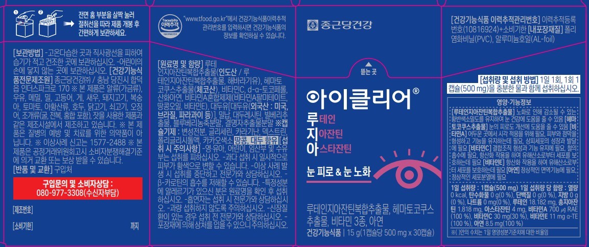 | 제품명 | 아이클리어 루테인지아잔틴아스타잔틴 | 제조업소의 명칭과 소재지 | 컨텐츠 참조 |