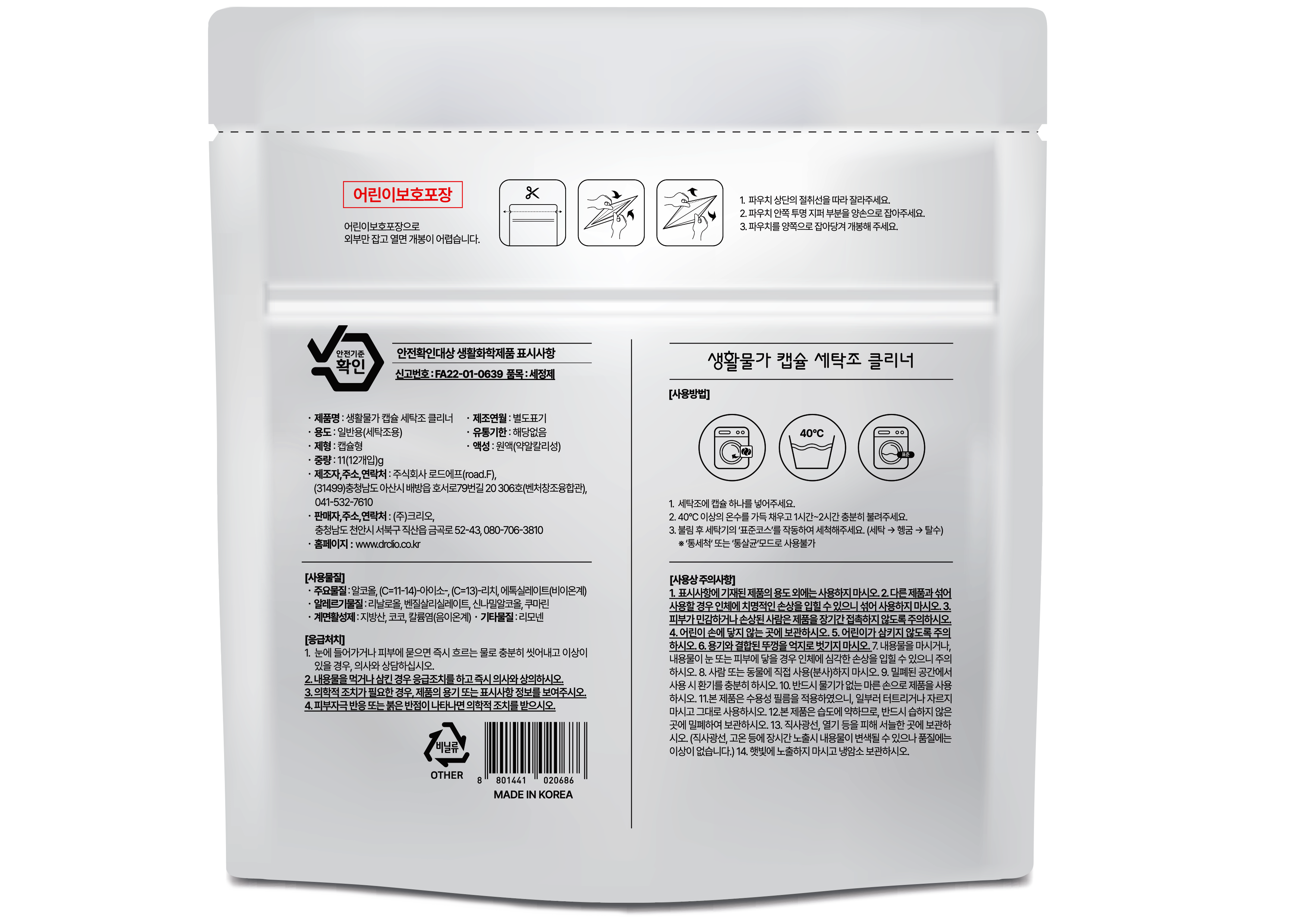 | 품목 및 제품명 | 세정제 / 생활물가 캡슐 세탁조 클리너 | 용도(표백제의 경우 계열을 함께표시) 및 제형 | 일반용-세탁조용 / 비분사형-캡슐형 |