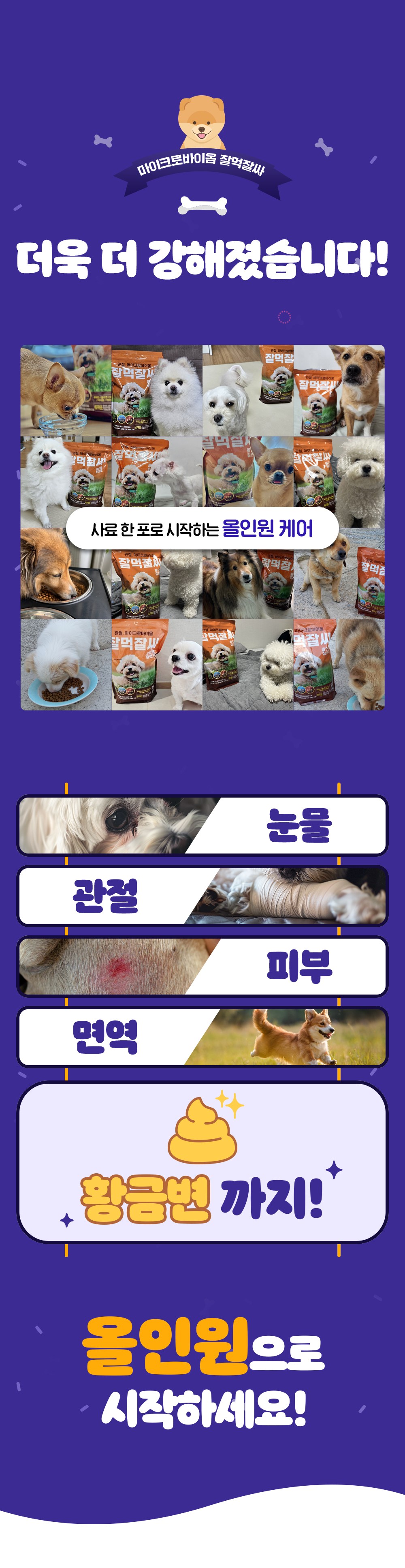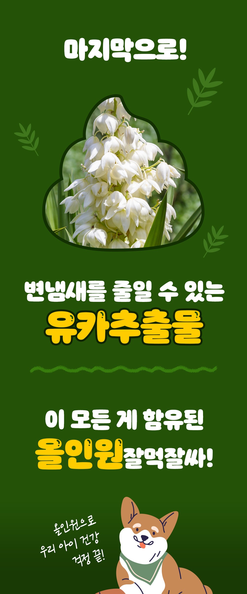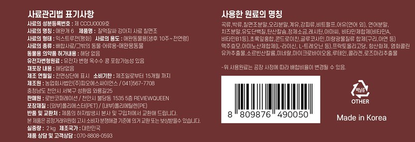 | 품명 및 모델명 | 잘먹잘싸 강아지 사료 칠면조 | 인증/허가 사항 | 사료관리법에 따른 성분등록번호 : 컨텐츠 참조 |