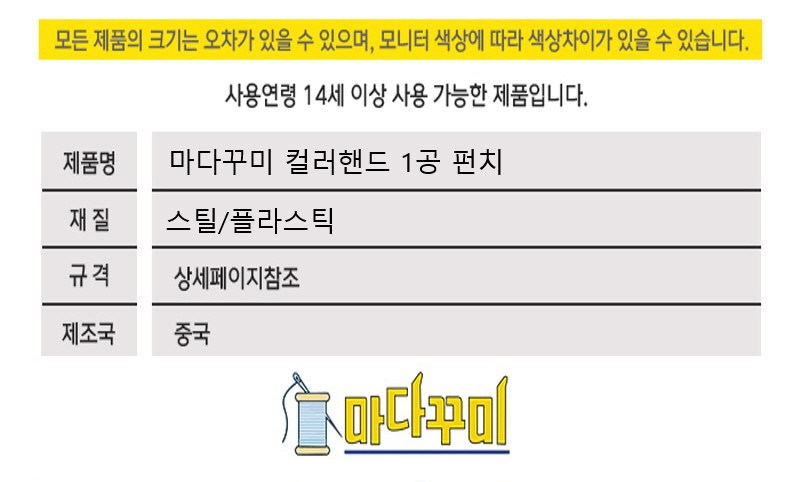 | 품명 및 모델명 | 마다꾸미 컬러 핸드 1공 펀치 파스텔퍼플 3mm | 인증/허가 사항 | 해당없음(14세이상) |