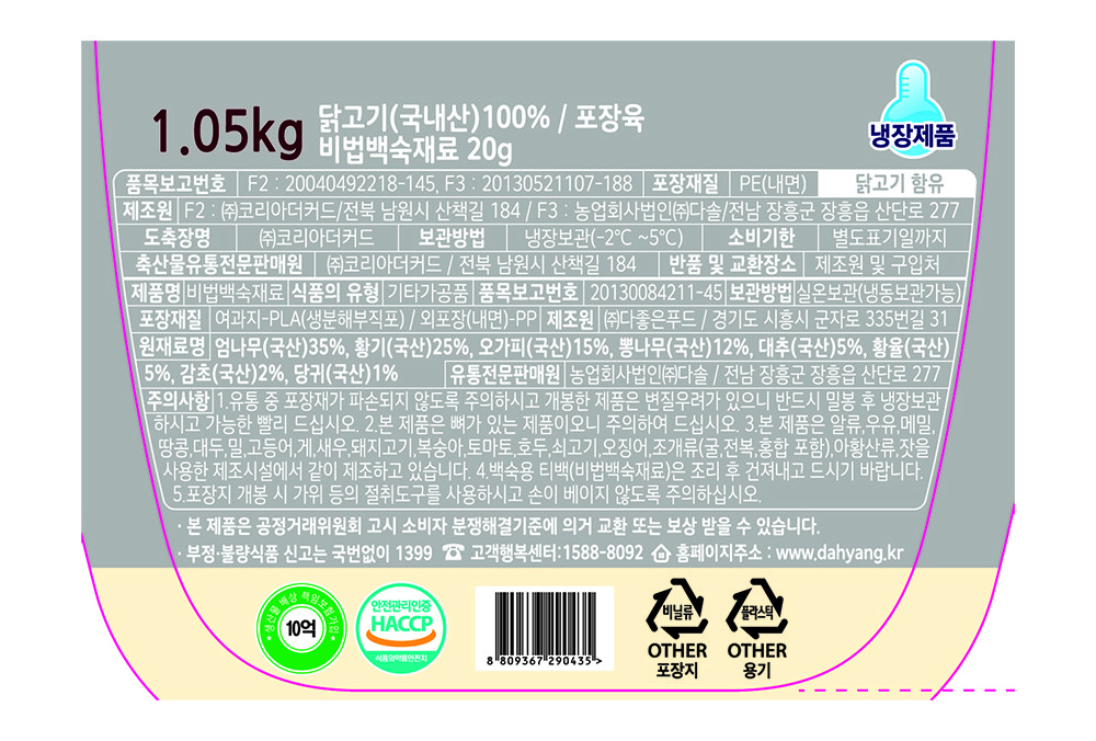 | 품목 또는 명칭 | 우리땅 토종닭 백숙용 + 비법백숙재료 | 포장단위별 내용물의 용량(중량),수량,크기 | 컨텐츠 참조 |