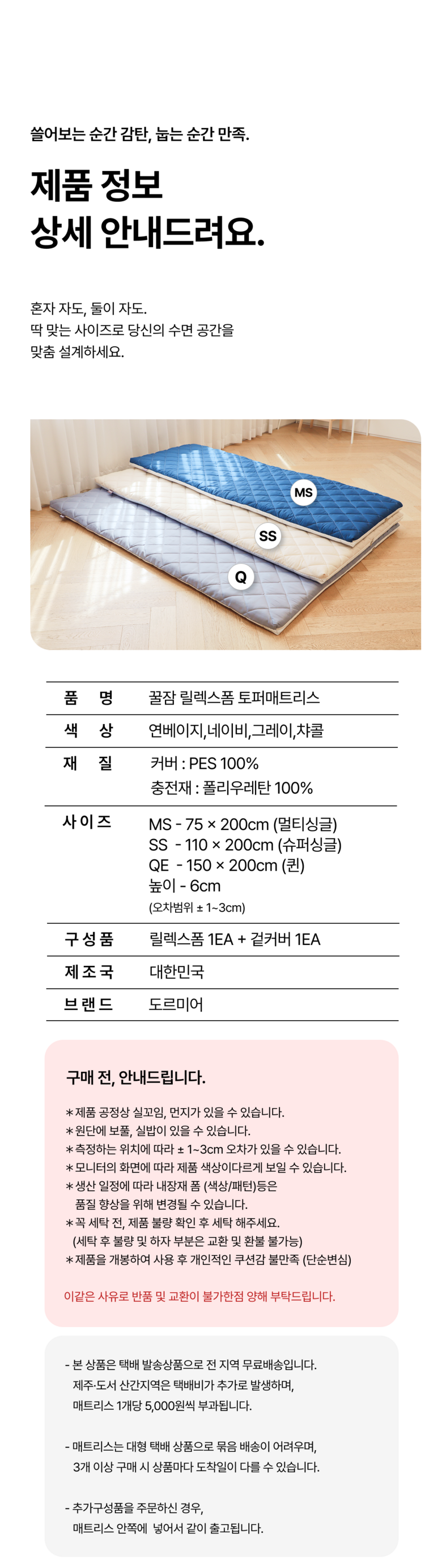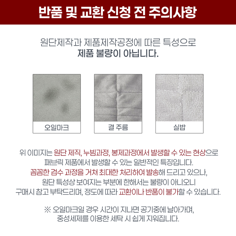 - ㆍ모니터 해상도의 차이로 인해 색상이나 이미지가 실제와 달라, 고객이 단순 변심으로 교환/반품을 무료로 요청하는 경우