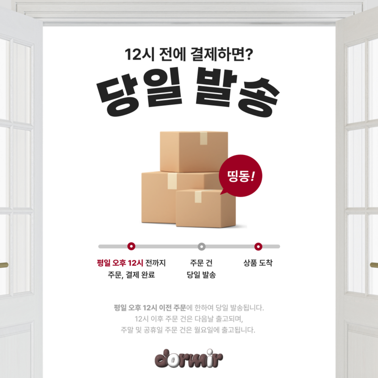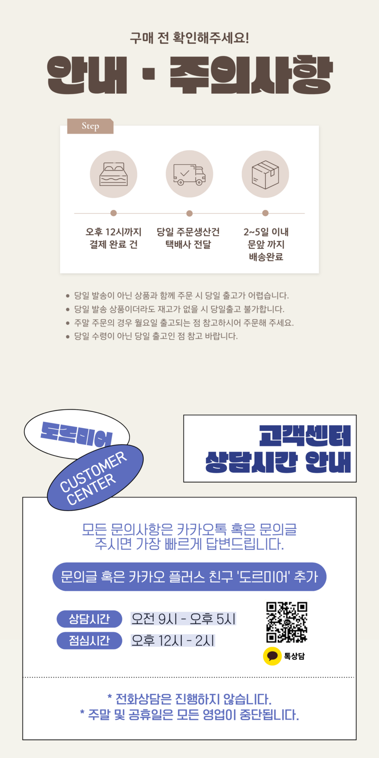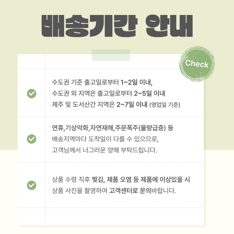 | 배송기간 | ㆍ도서산간 지역 등은 배송에 3-5일이 더 소요될 수 있습니다. - 천재지변, 물량 수급 변동 등 예외적인 사유 발생 시, 다소 지연될 수 있는 점 양해 부탁드립니다. | ||