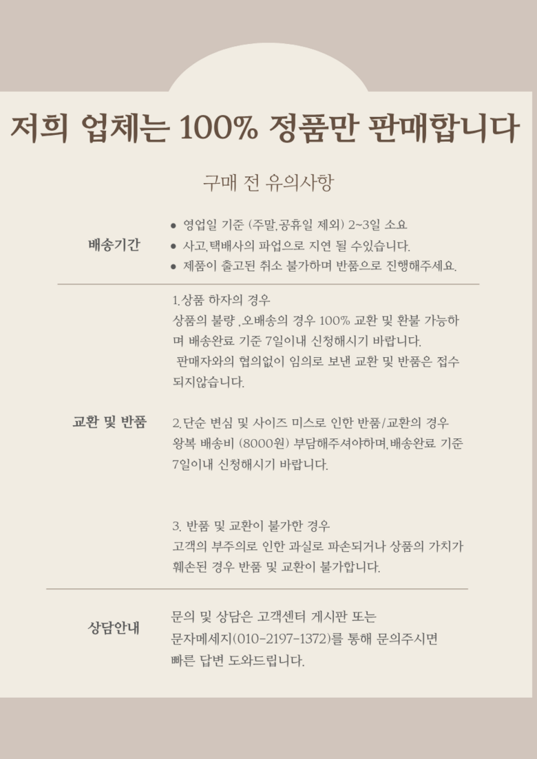 - ㆍ모니터 해상도의 차이로 인해 색상이나 이미지가 실제와 달라, 고객이 단순 변심으로 교환/반품을 무료로 요청하는 경우