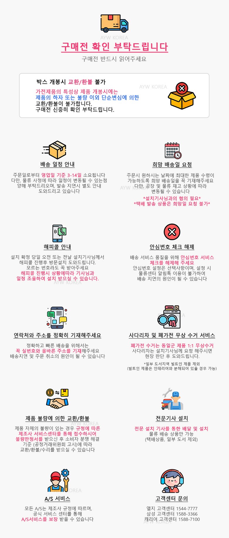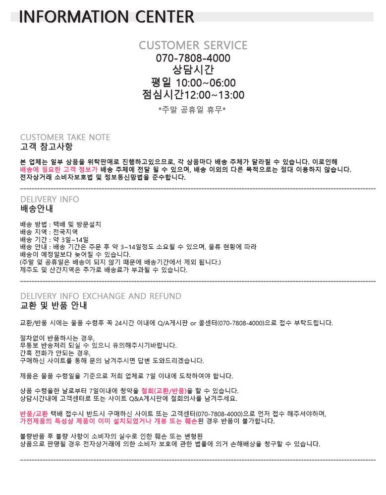 - ㆍ교환/반품에 관한 일반적인 사항은 판매자가 제시사항보다 관계법령이 우선합니다.