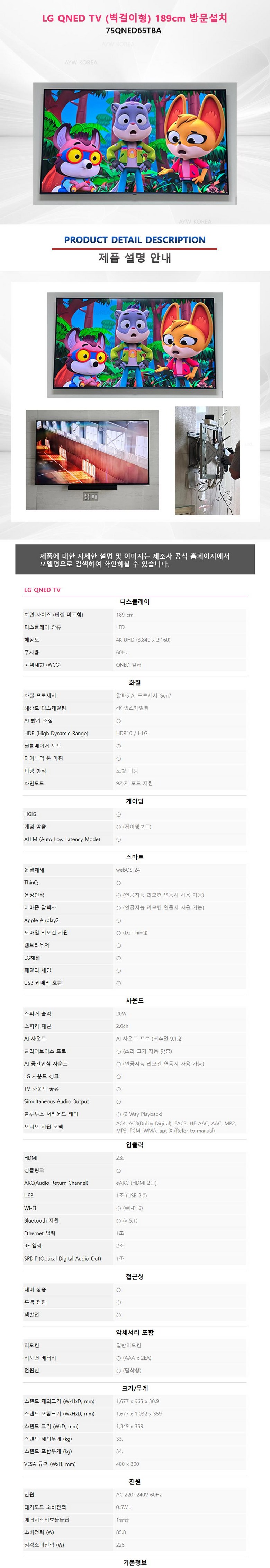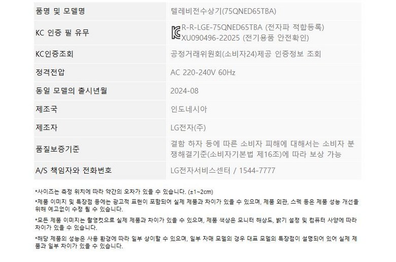 | 품명 및 모델명 | TV/75QNED65TBA | KC 인증정보 | 본품 : XU090496-22025A,R-R-LGE-75QNED65TBA , 건전지 : B052R346-6001B |