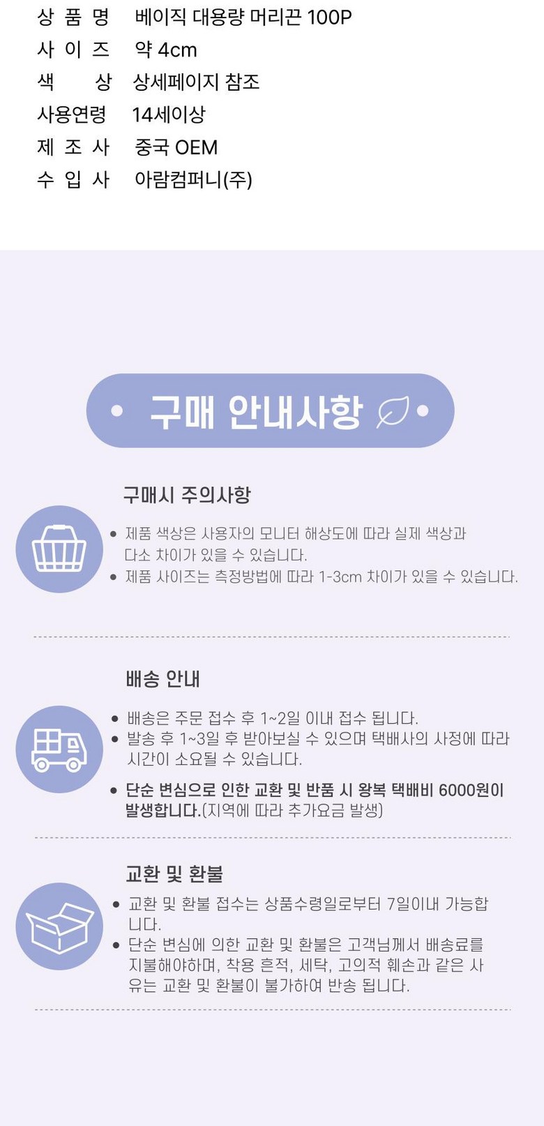 | 품명 및 모델명 | 멜로우앤유 기본 베이직 대용량 머리끈 100P | 인증/허가 사항 | 상품 상세페이지 참조 |