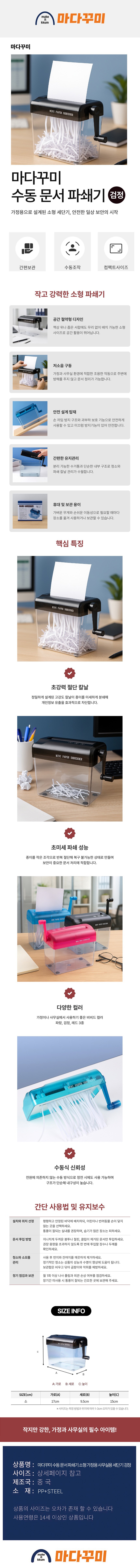 | 품명 및 모델명 | 마다꾸미 수동 문서 파쇄기 소형 가정용 사무실용 세단기 01.검정 | 인증/허가 사항 | 해당없음(14세이상) |