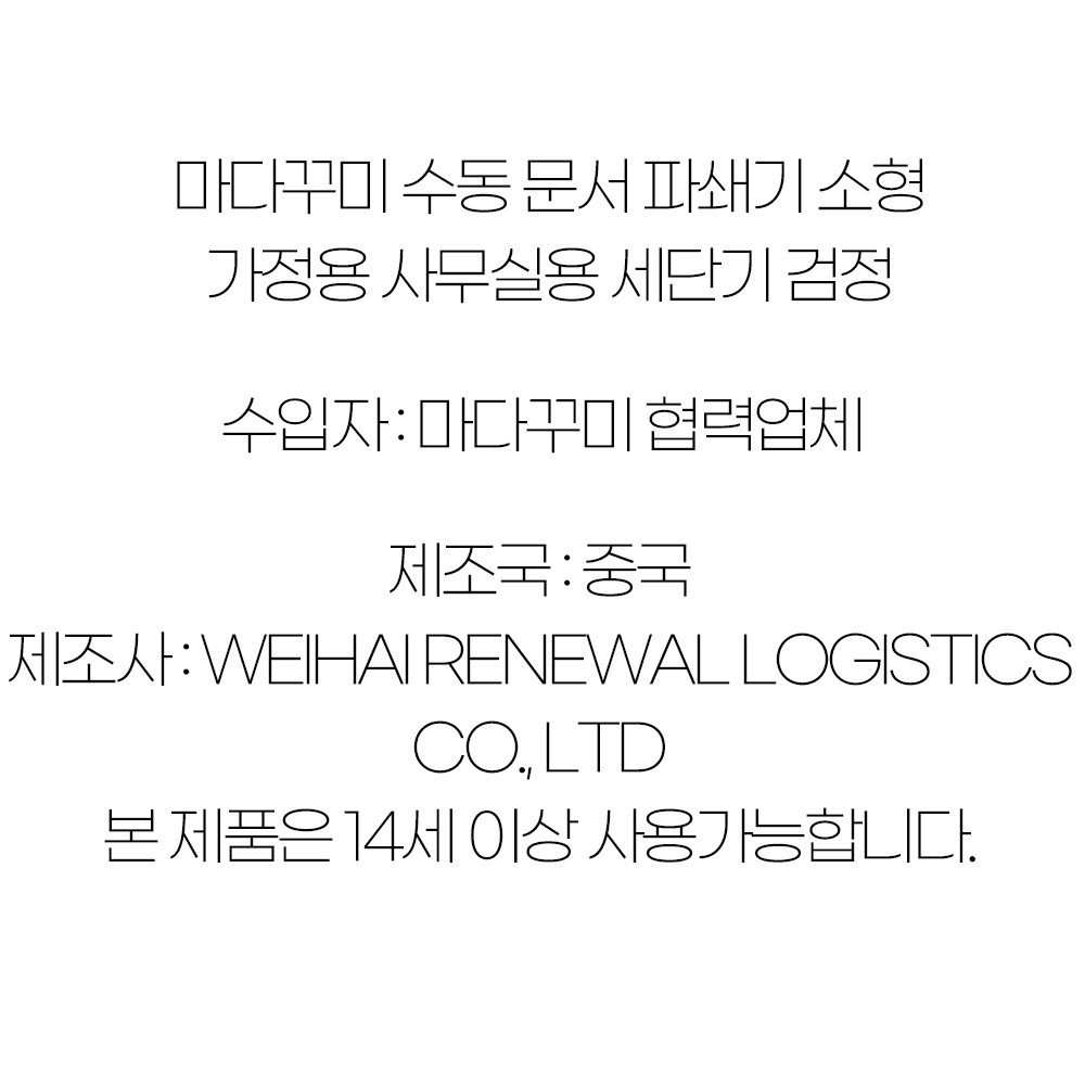 | 제조국(원산지) | 중국 | 제조자(수입자) | WEIHAI RENEWAL LOGISTICS CO.,LTD/마다꾸미 협력업체(정확한 수입자 정보 업체 미제공) |