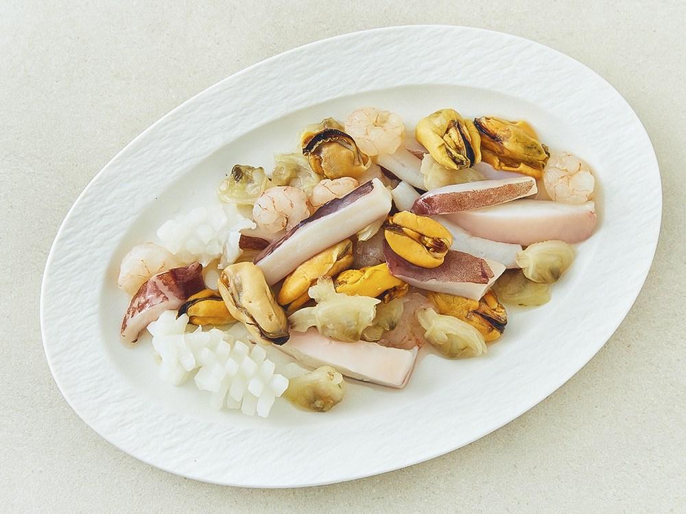 오징어 귀채, 자숙 홍합살, 자숙 바지락살, 솔방울 오징어, 적새우살로 구성되어 있습니다.