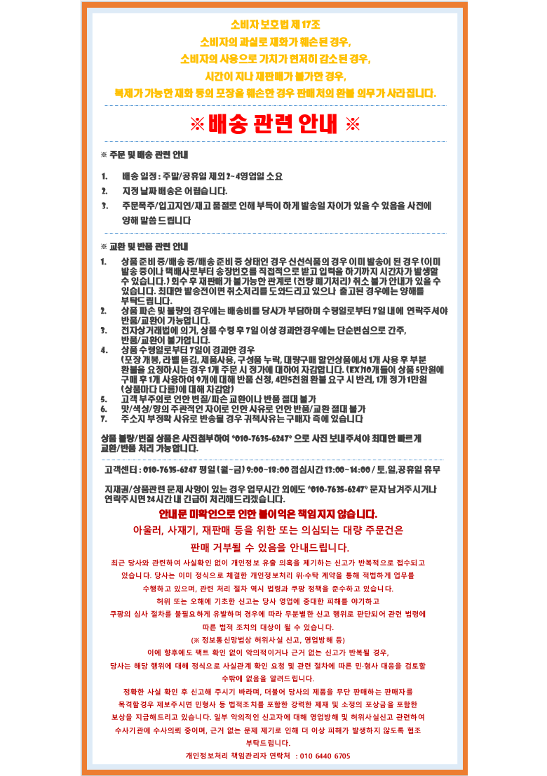 - ㆍ교환/반품에 관한 일반적인 사항은 판매자가 제시사항보다 관계법령이 우선합니다.