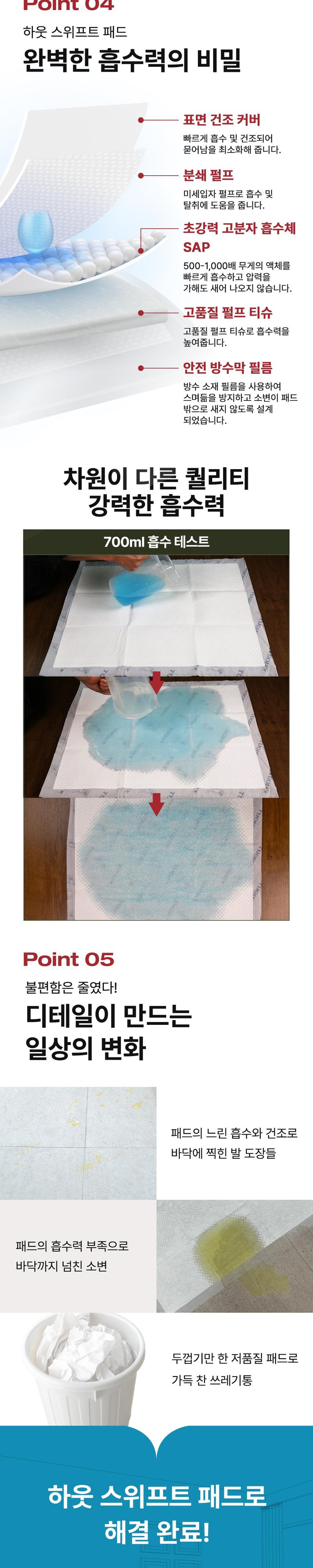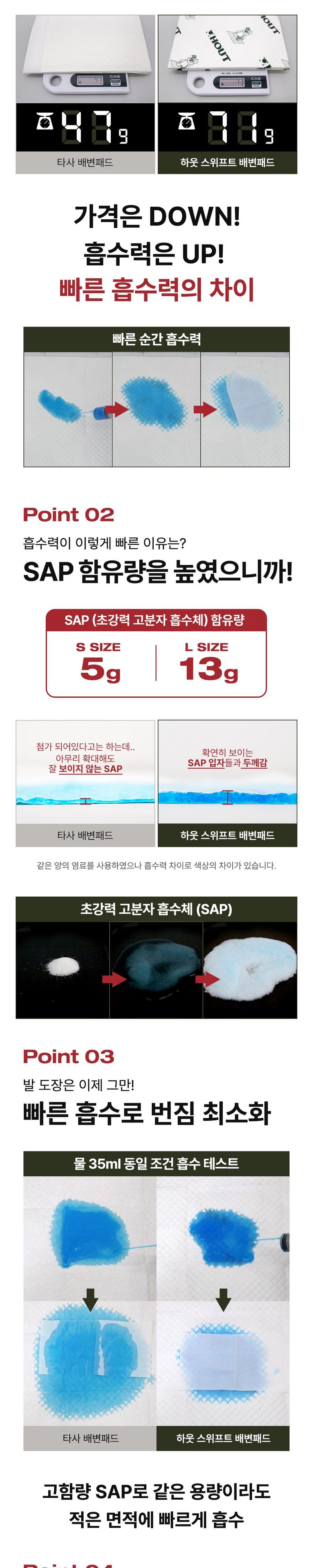 - 흡수력: 고흡수성수지 (SAP) 포함