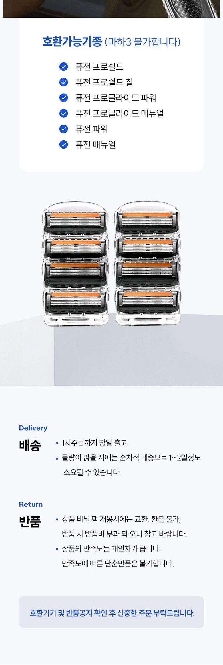| 품명 및 모델명 | 비밀의집 질레트 호환 프리미엄 면도날 | 인증/허가 사항 | 해당사항 없음 |