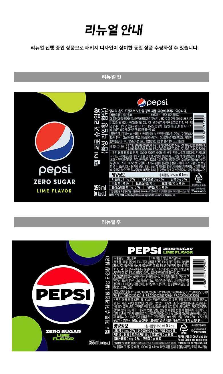 | 제품명 | 펩시제로 슈거라임향 | 식품의 유형 | 컨텐츠 참조 |