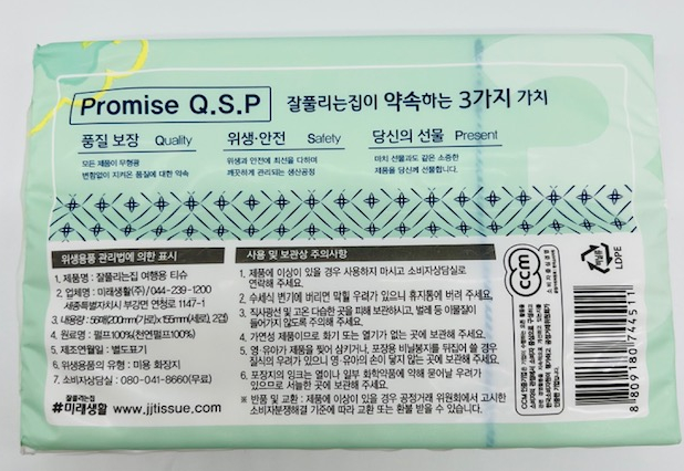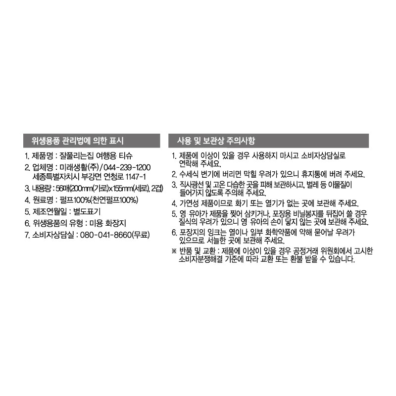 | 품명 및 모델명 | 잘풀리는집 여행용 티슈 56매 | 인증/허가 사항 | 위생용품 |