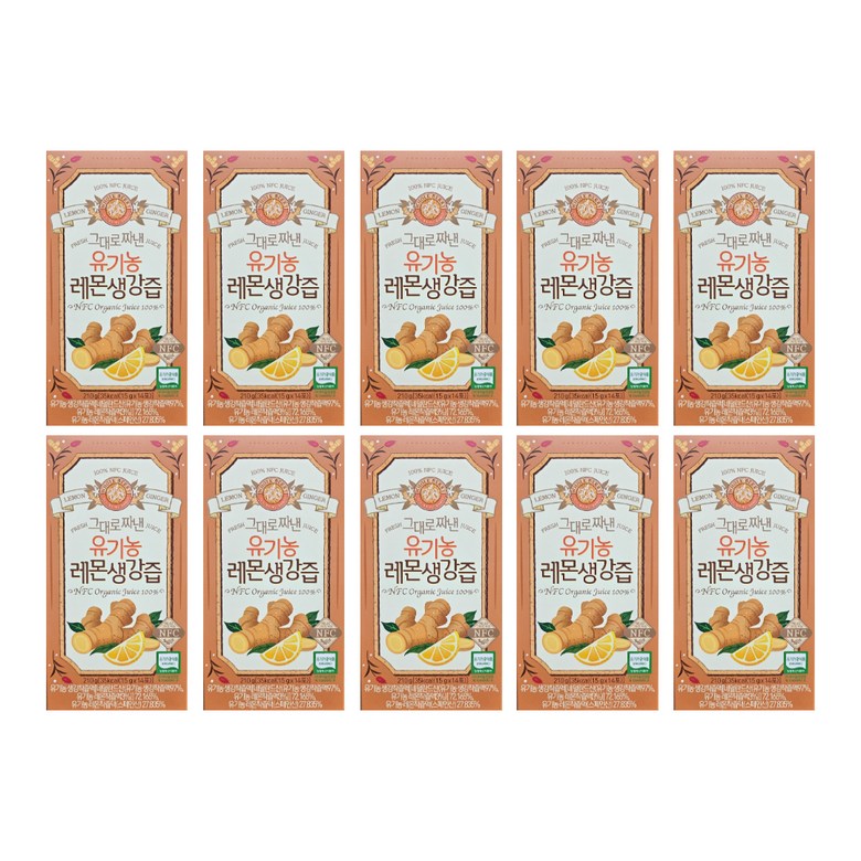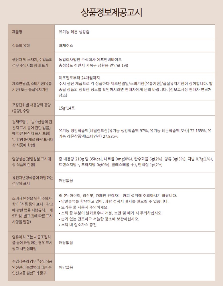 | 포장단위별 내용물의 용량(중량), 수량 | 15gx14포/박스 | 원재료명 및 함량 | 유기농 생강착즙액[네덜란드산(유기농 생강착즙액 97%, 유기농 레몬착즙액 3%)] 72.165%, 유기농 레몬착즙액(스페인산) 27.835% |